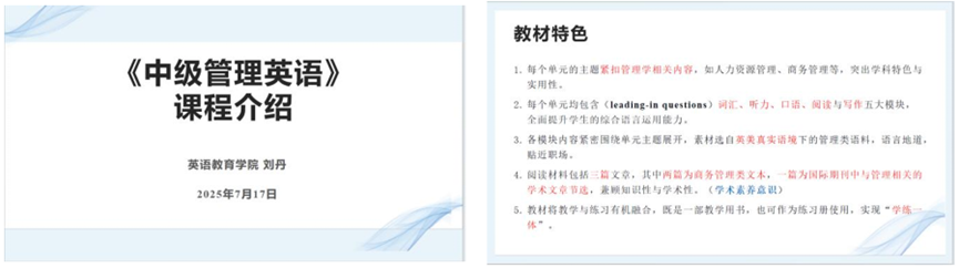 2025年7月17日,广东外语外贸大学qmh球盟会亚博中级专门用途英语教学部一年级管理英语课程组开展教研活动。本次教研活动由刘丹老师主讲,重点介绍了《中级管理英语》教材的编写理念、单元结构、授课内容、教学进度安排及考核方式等内容。刘亮星副院长、陶玉梅主任和孙红主任分别就课程单元内容和考试安排提出了补充意见和建设性建议。课程组薛瑛、赵林森等老师参加会议。
